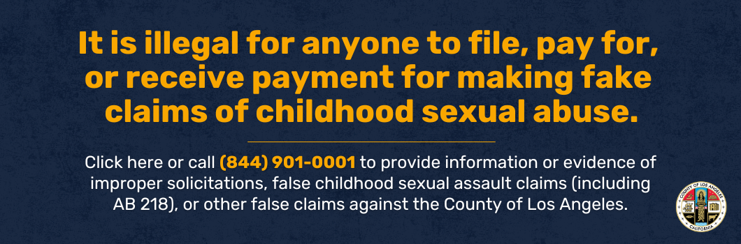 It is illegal for any person to file, pay for or receive payment for making false claims of childhood sexual abuse against the County of Los Angeles.